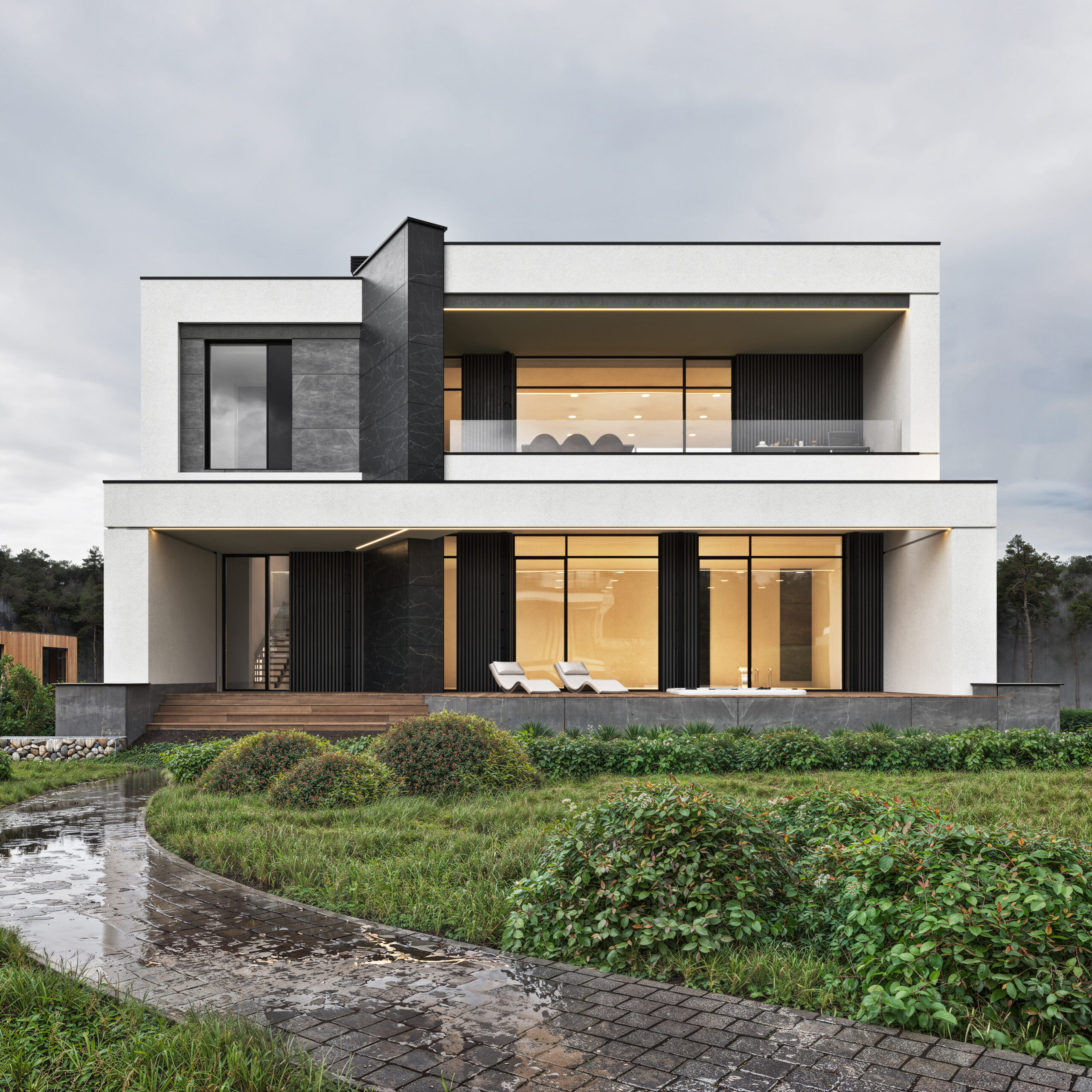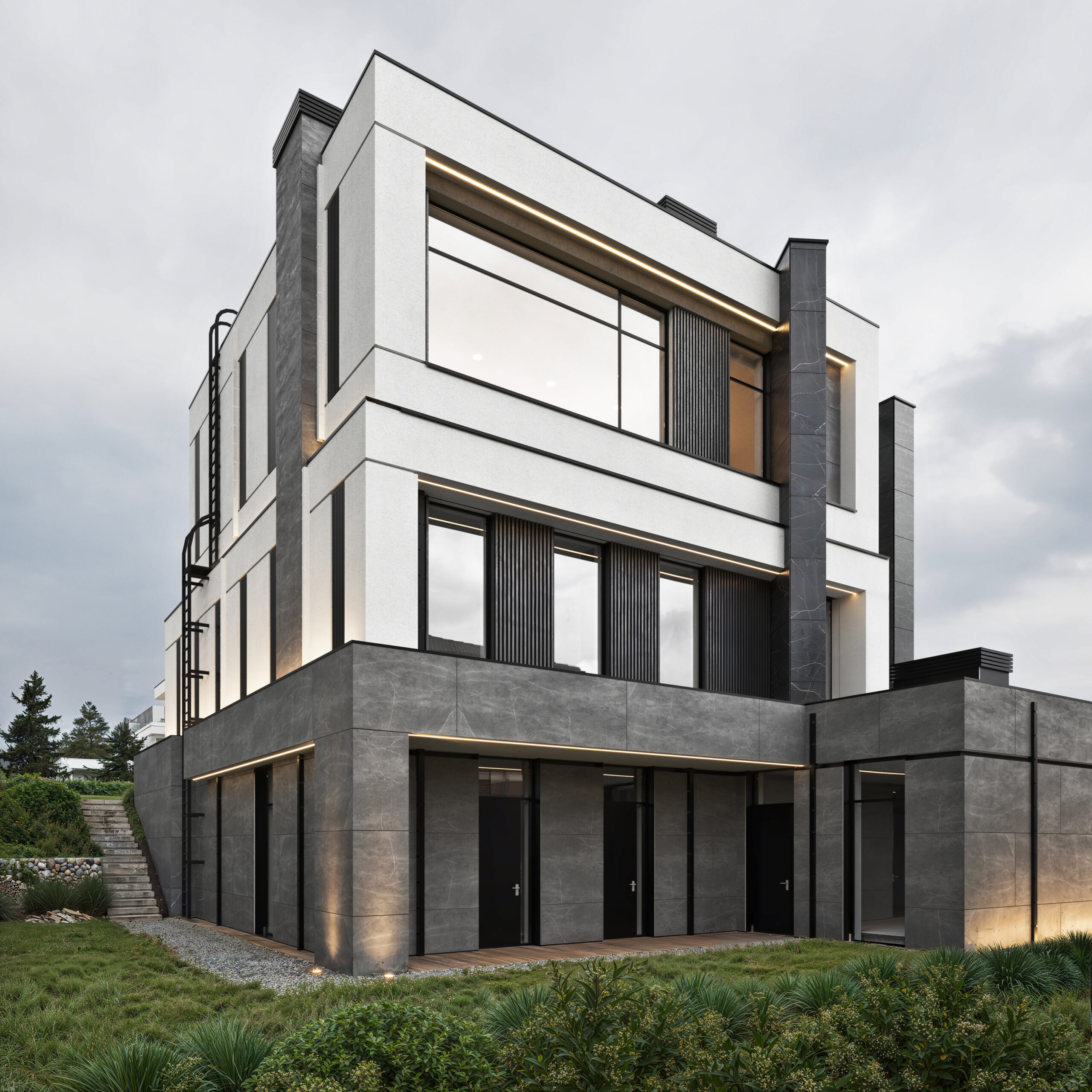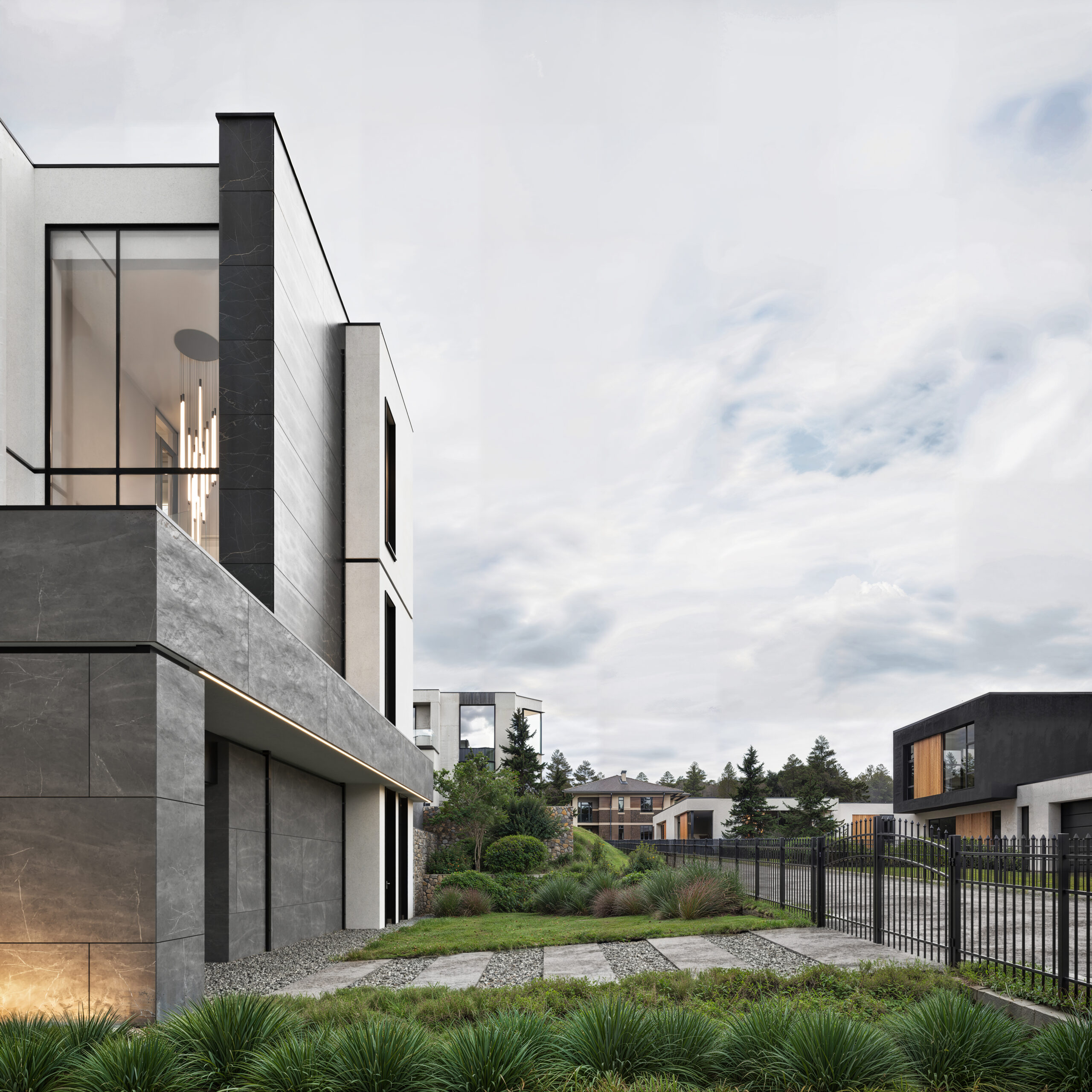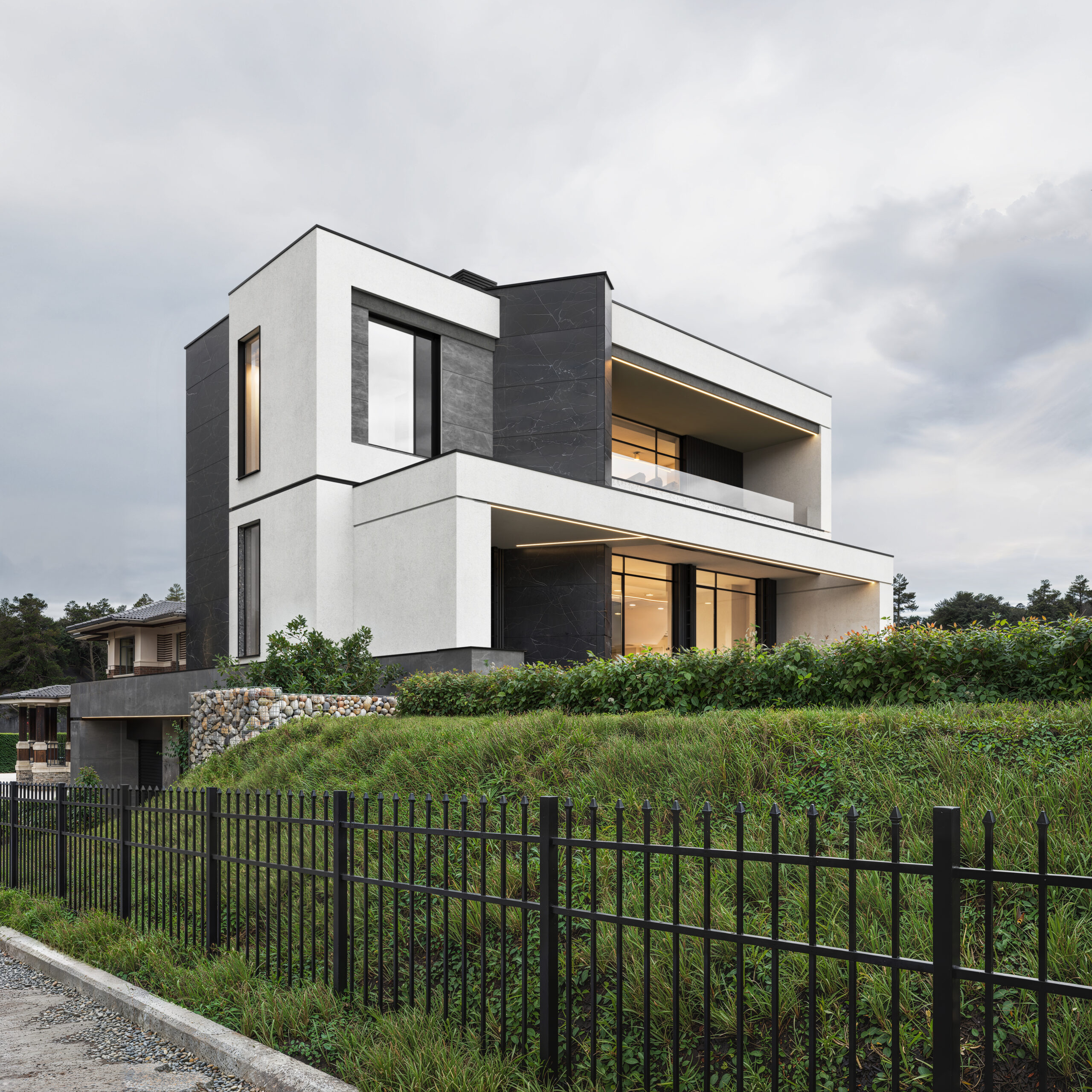 Современный СПА-комплекс, расположенный между двумя участками, гармонично вписан в рельеф с частично заглубленным цокольным этажом. Проект сохраняет стилистику основного дома благодаря использованию белой штукатурки, серого и темного керамогранита, а также декоративных черных реек.
