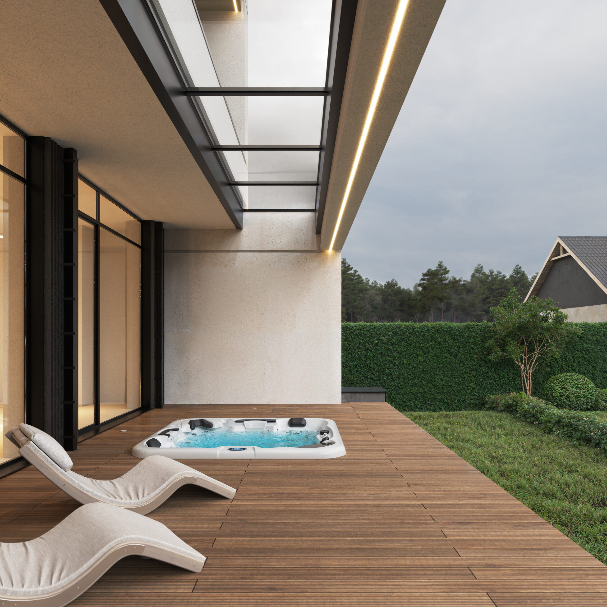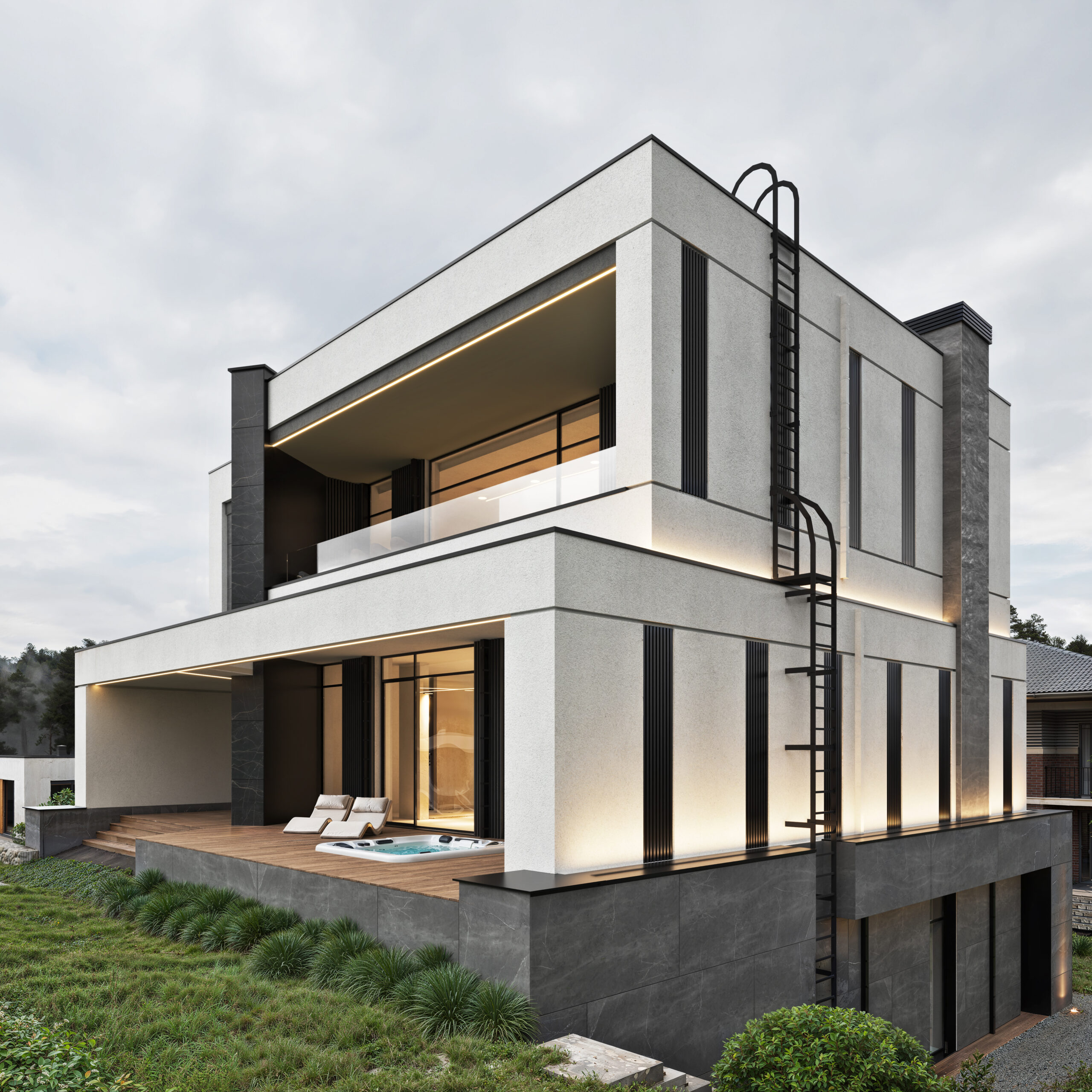 Витражное остекление и стеклянные ограждения создают легкость и открывают виды на природу. На террасе предусмотрено джакузи, дополняющее зону отдыха. Архитектурное решение сочетает современный стиль с функциональностью и премиальным комфортом.