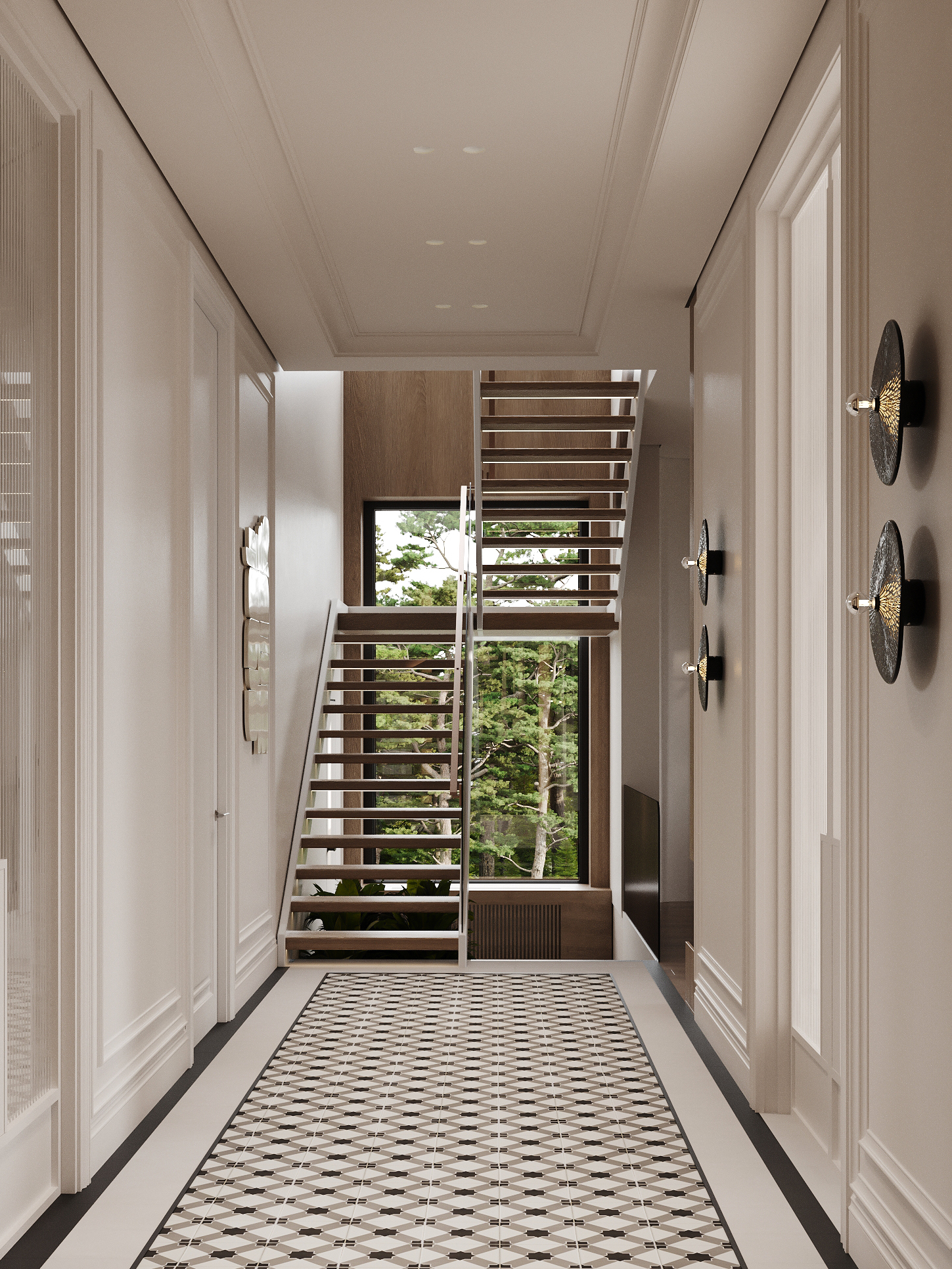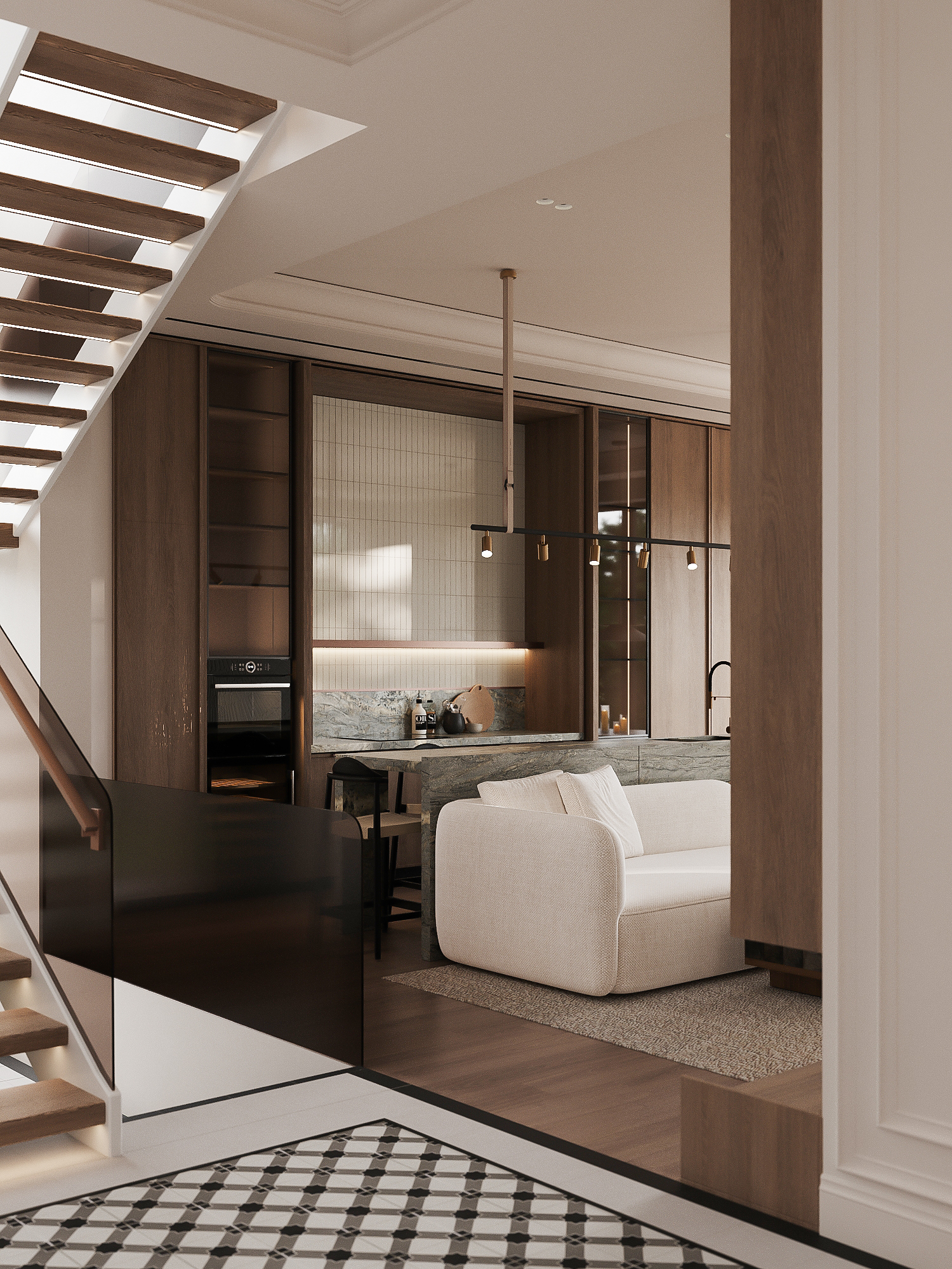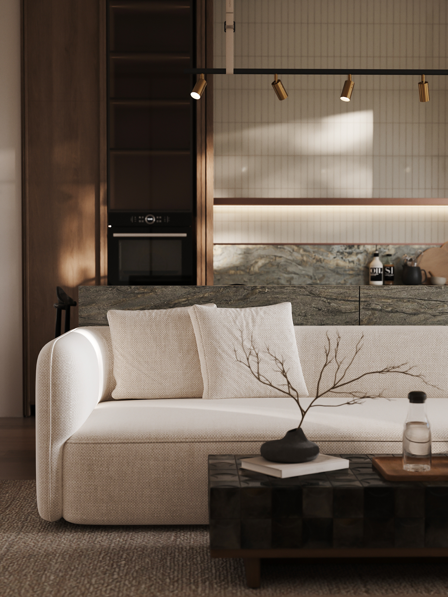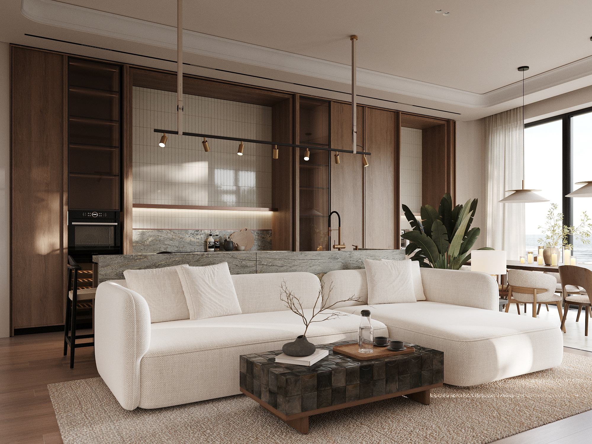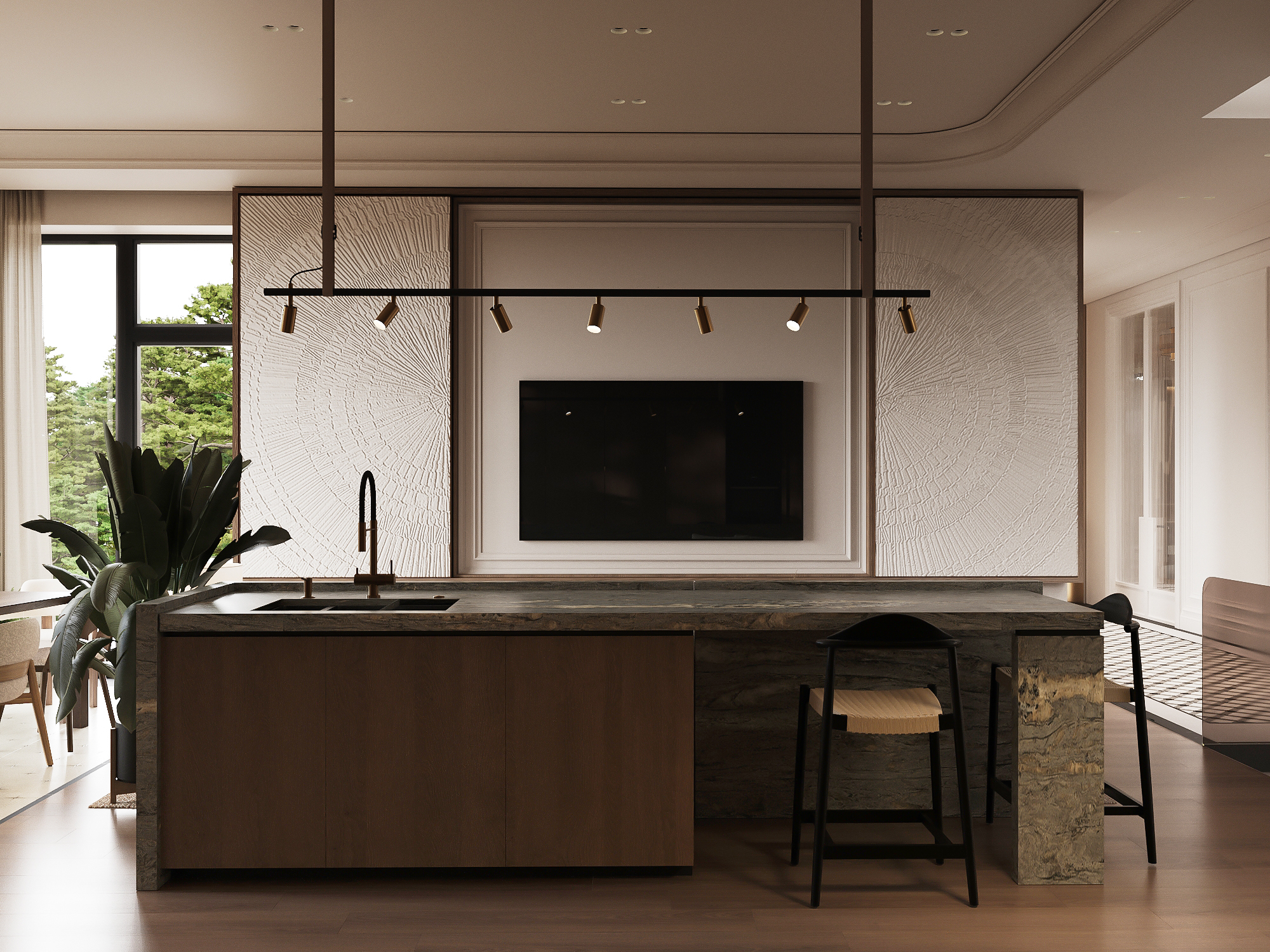 Современный интерьер выполнен в светлой, уютной палитре с акцентом на натуральные материалы и гармоничное сочетание дерева, камня и мягких тканей. Пространство объединяет все помещения, обеспечивая комфорт и функциональность для повседневной жизни и встреч с гостями. Большие окна наполняют помещение естественным светом, создавая атмосферу легкости и спокойствия