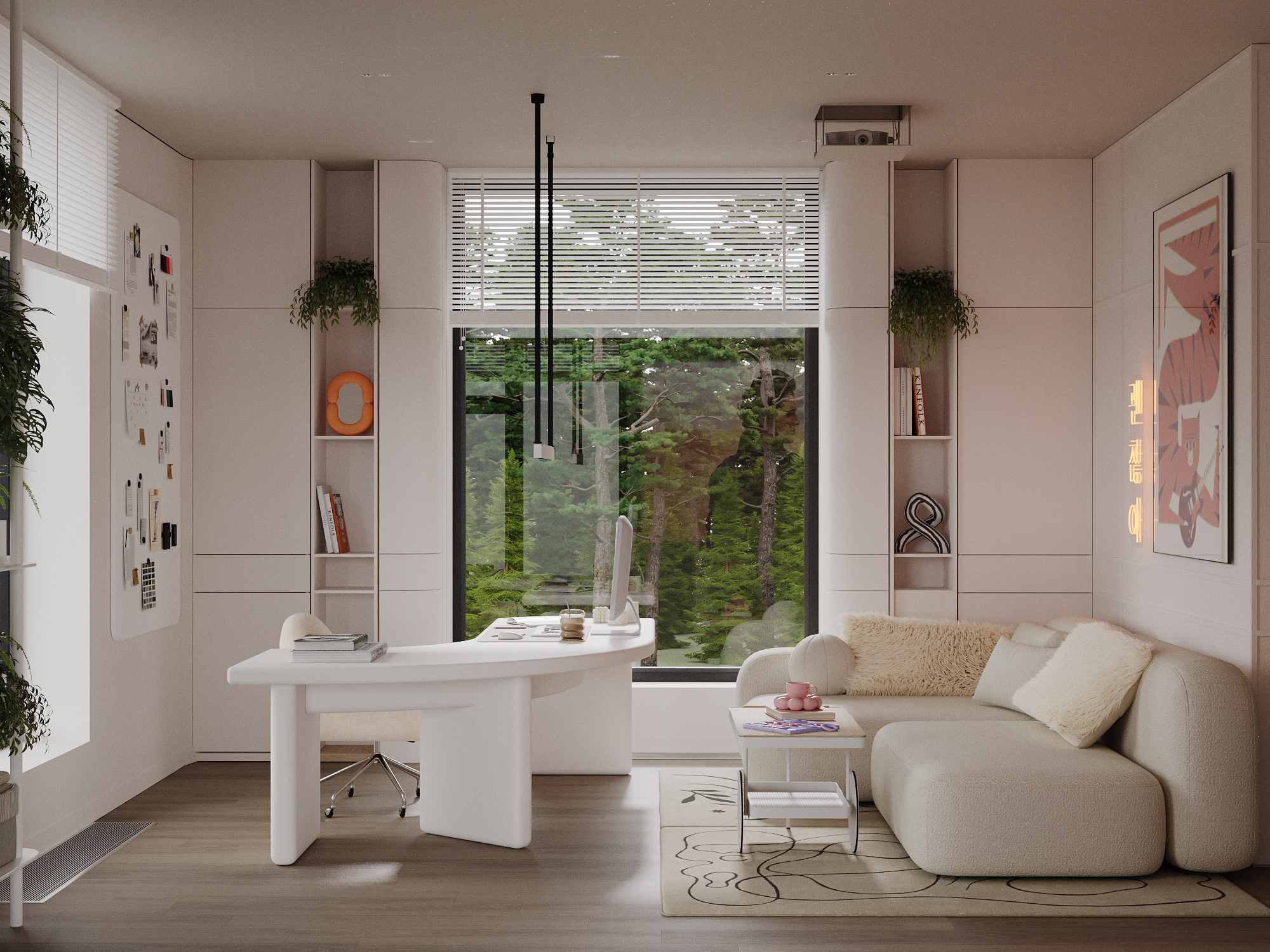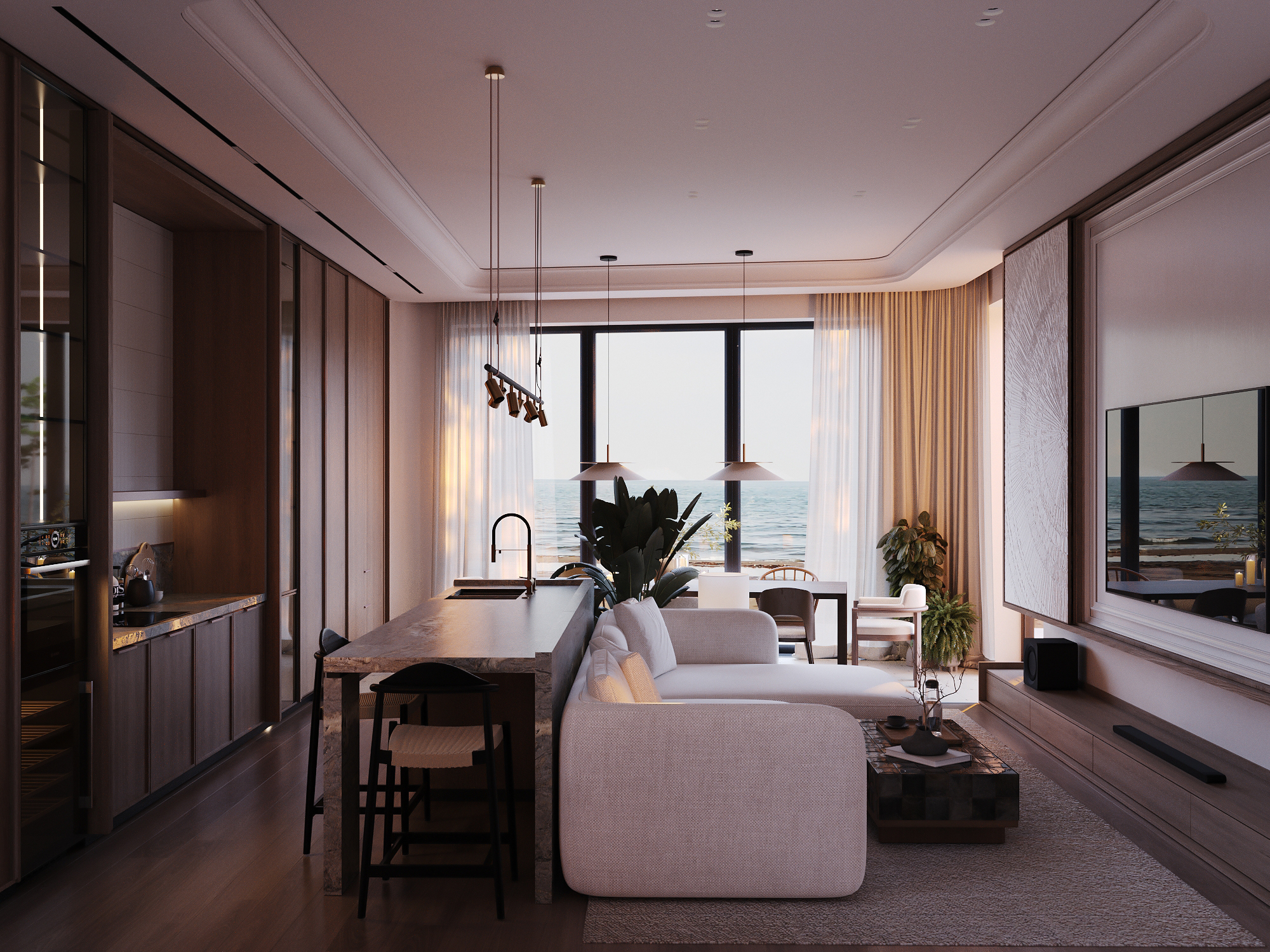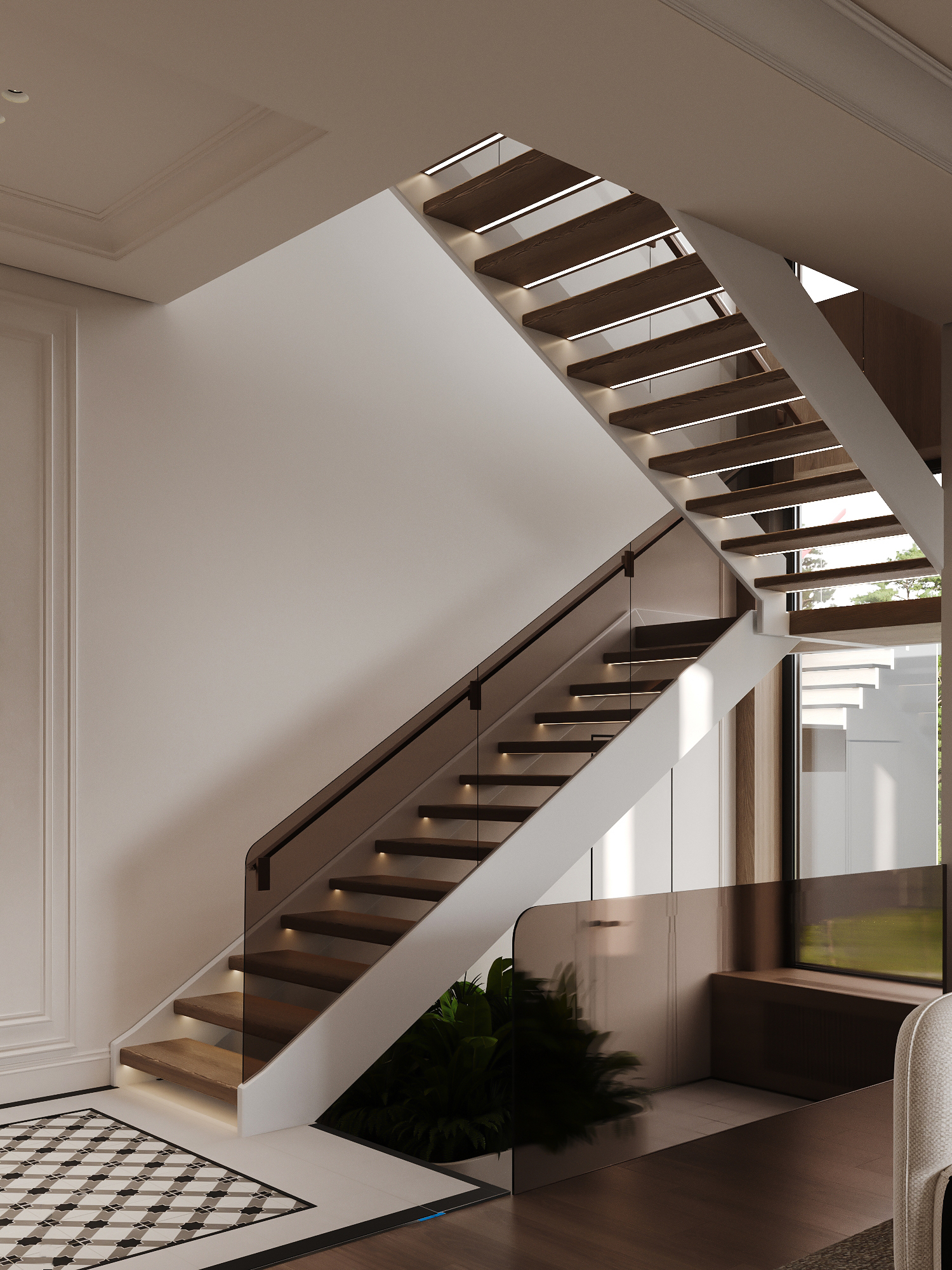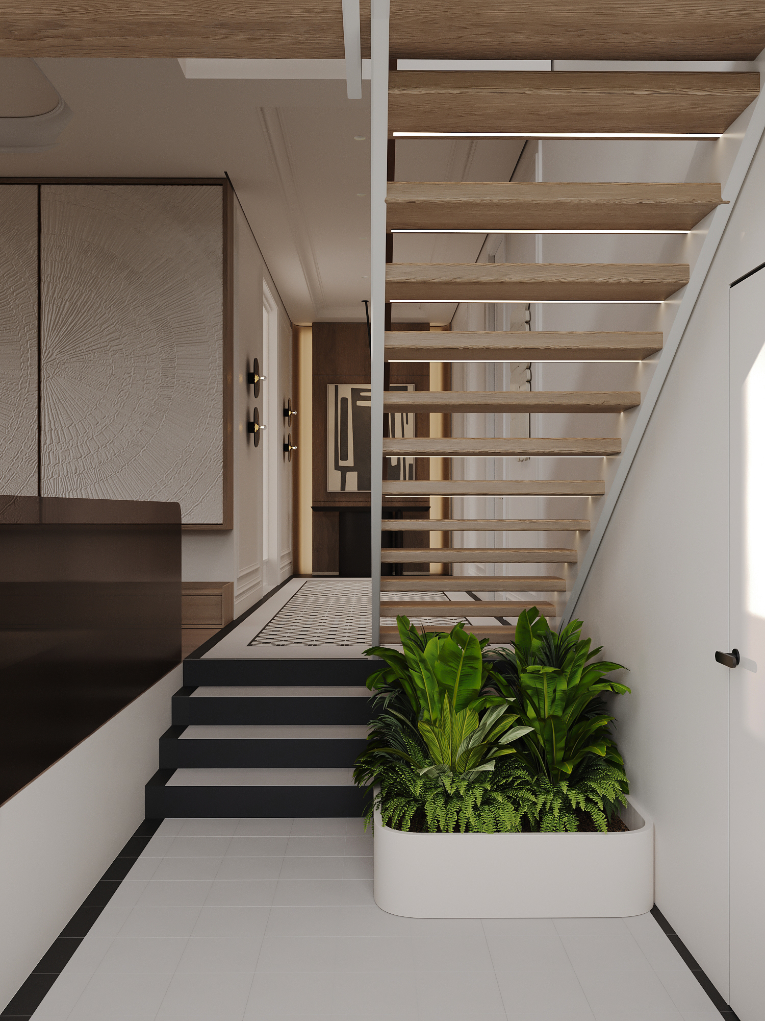 Современный интерьер выполнен в светлой, уютной палитре с акцентом на натуральные материалы и гармоничное сочетание дерева, камня и мягких тканей. Пространство объединяет все помещения, обеспечивая комфорт и функциональность для повседневной жизни и встреч с гостями. Большие окна наполняют помещение естественным светом, создавая атмосферу легкости и спокойствия