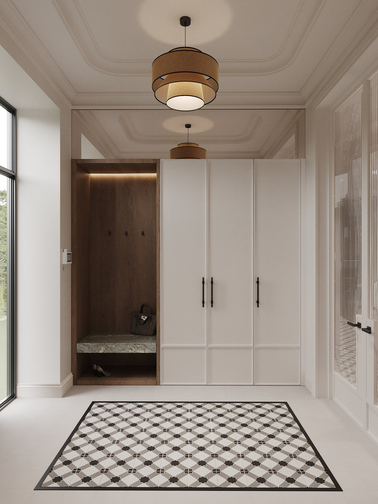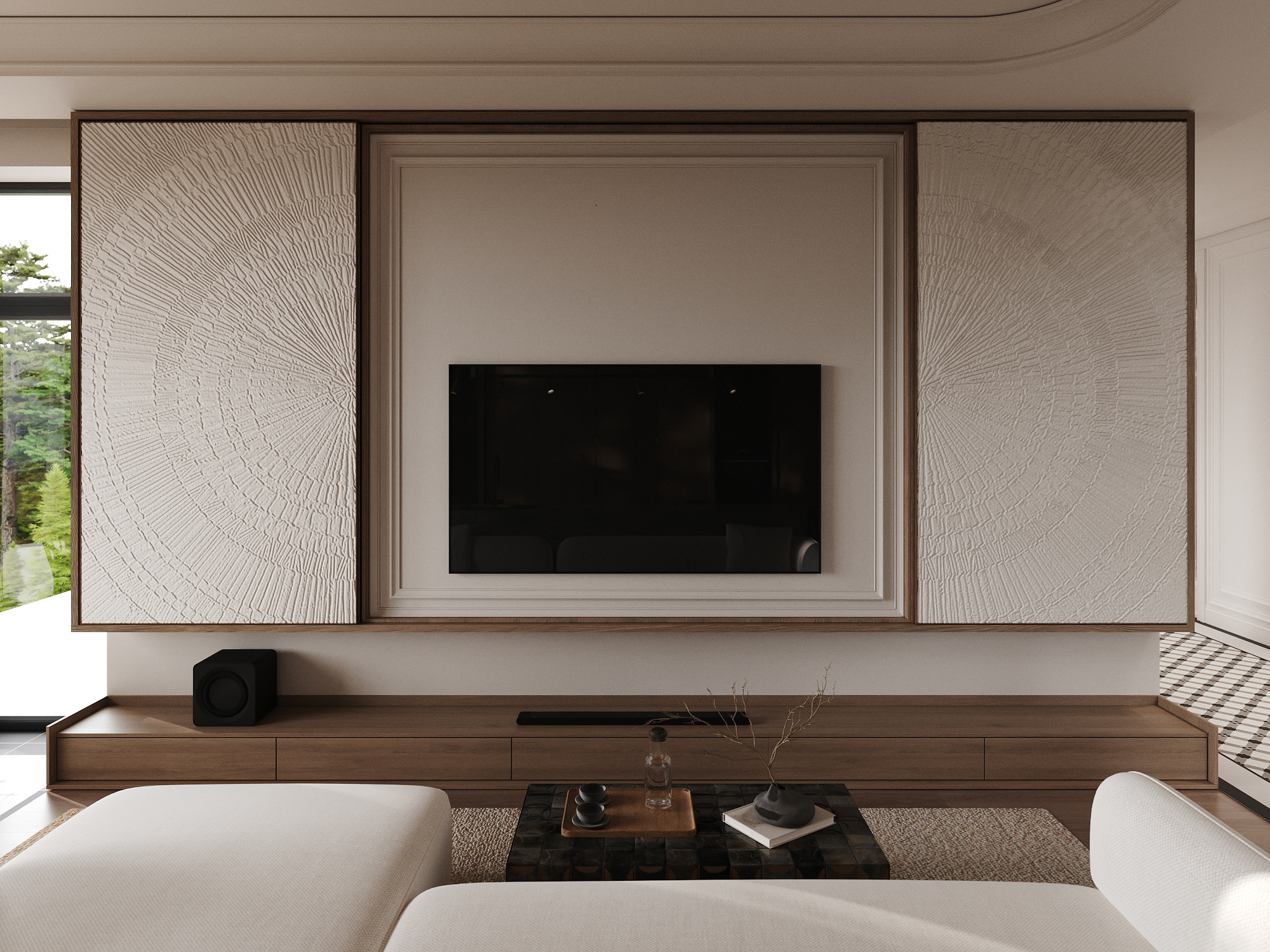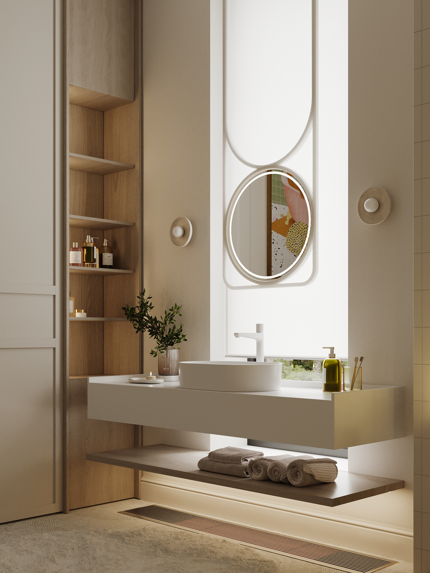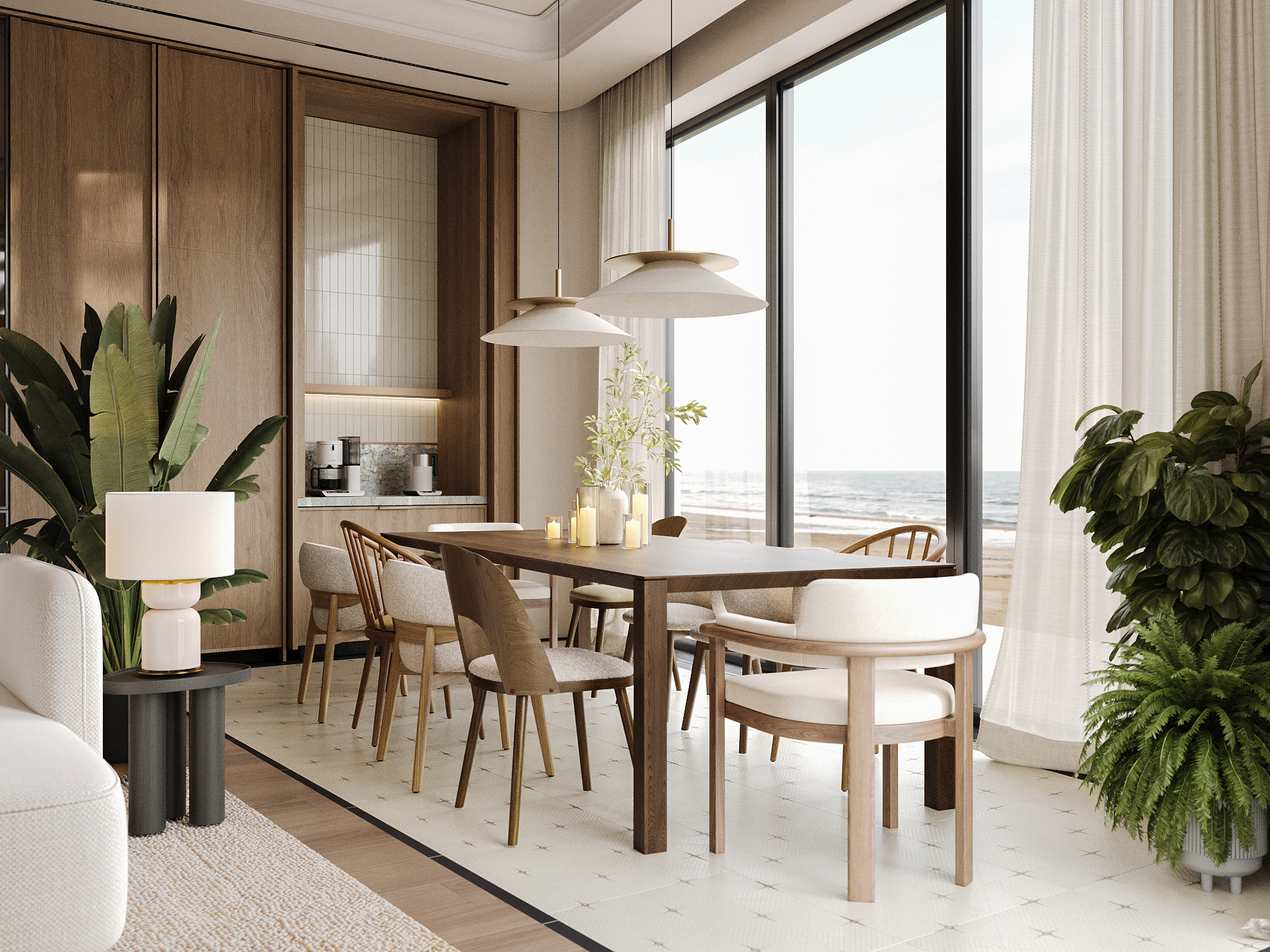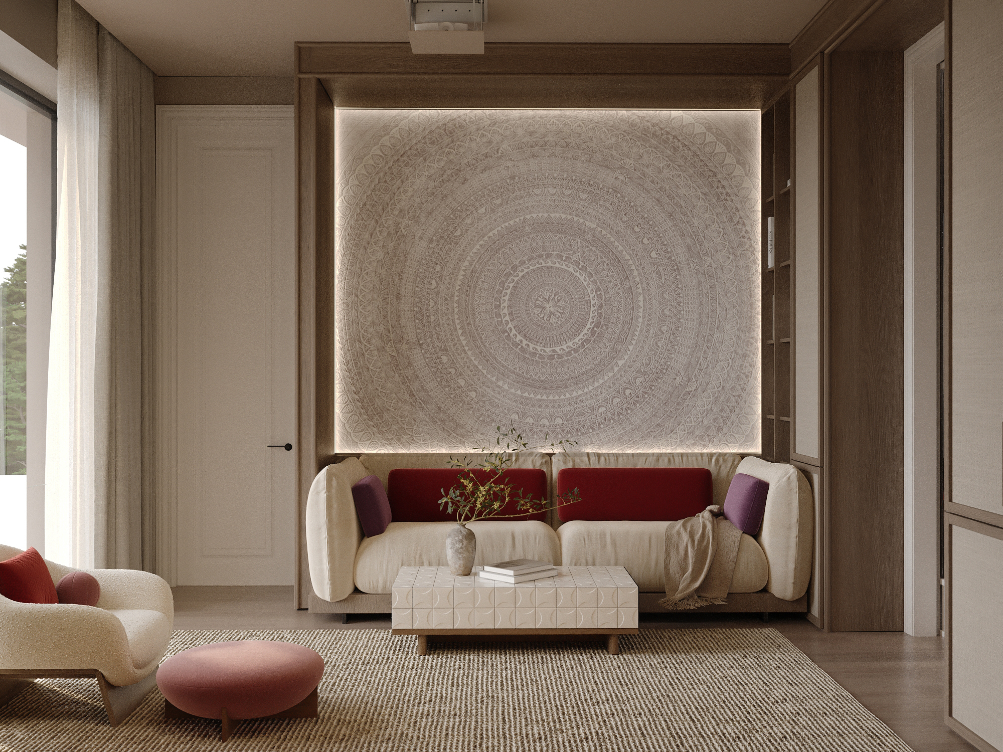 Современный интерьер выполнен в светлой, уютной палитре с акцентом на натуральные материалы и гармоничное сочетание дерева, камня и мягких тканей. Пространство объединяет все помещения, обеспечивая комфорт и функциональность для повседневной жизни и встреч с гостями. Большие окна наполняют помещение естественным светом, создавая атмосферу легкости и спокойствия