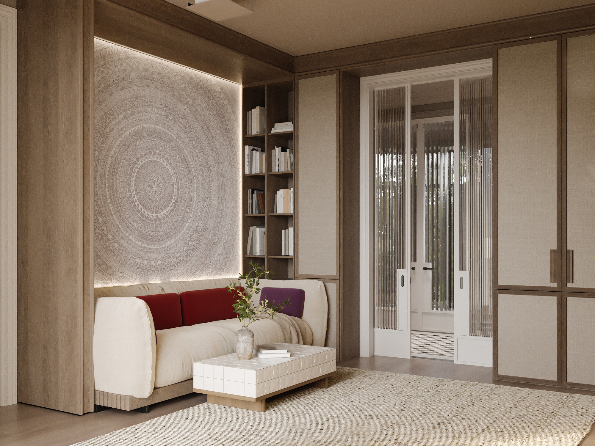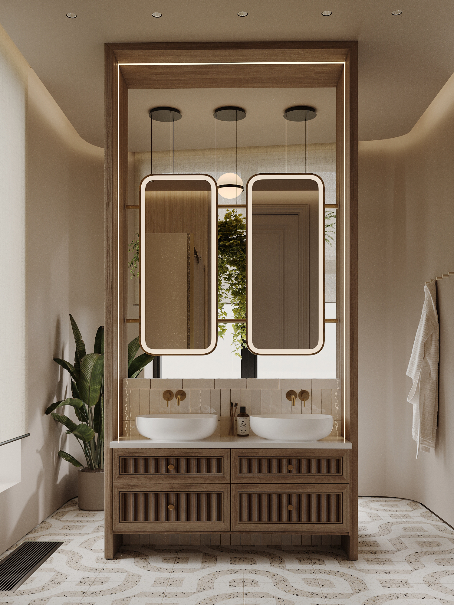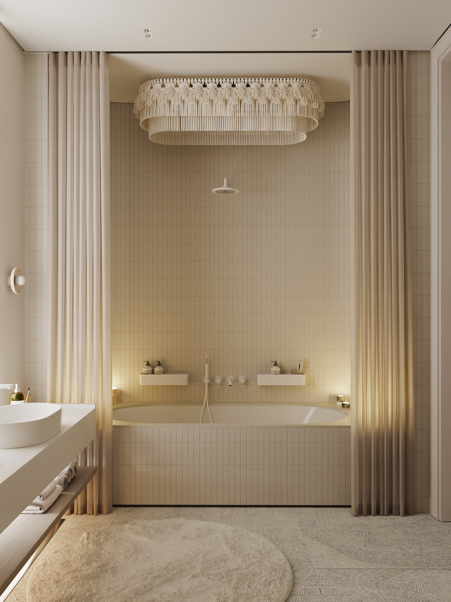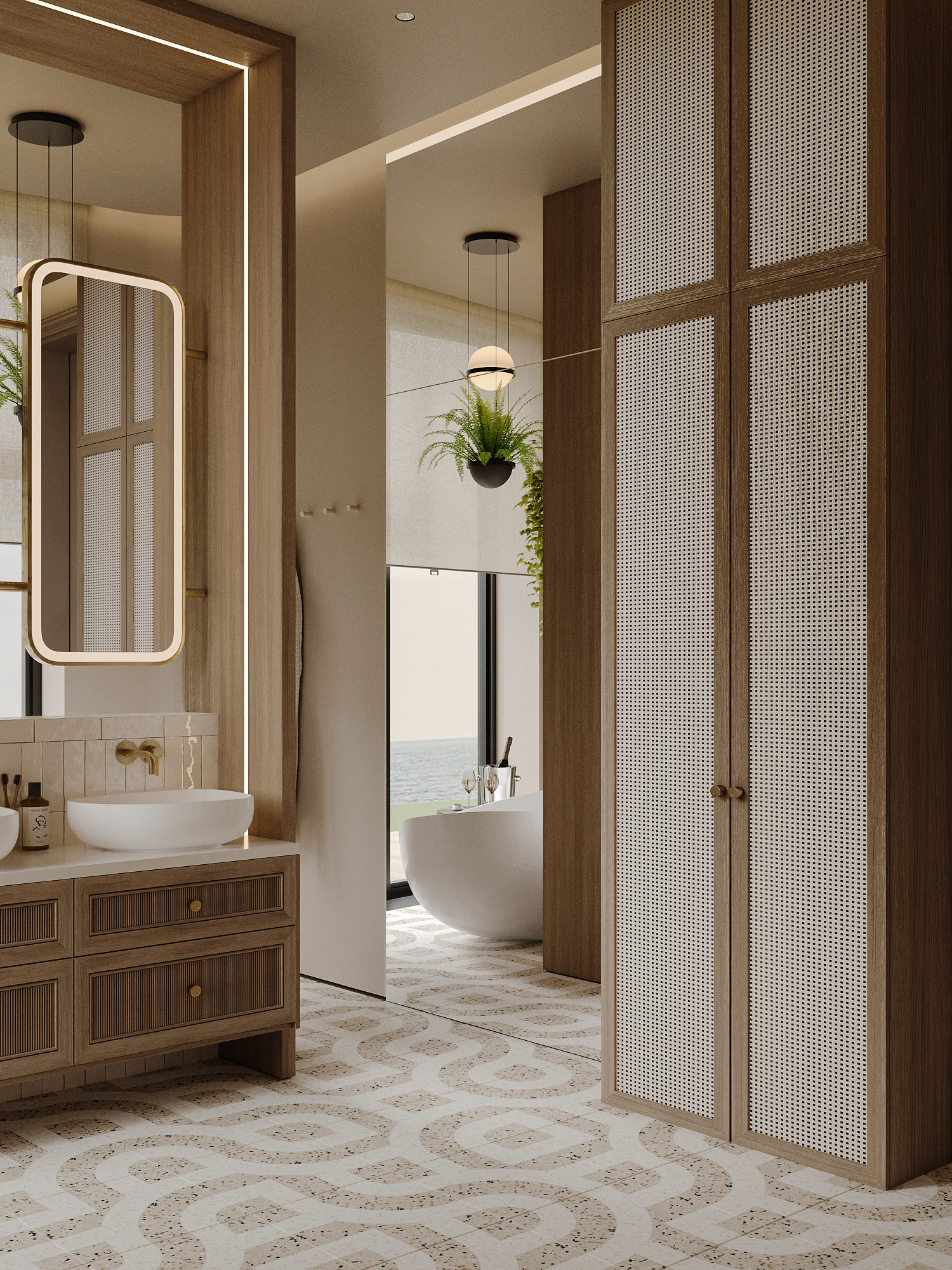 Современный интерьер выполнен в светлой, уютной палитре с акцентом на натуральные материалы и гармоничное сочетание дерева, камня и мягких тканей. Пространство объединяет все помещения, обеспечивая комфорт и функциональность для повседневной жизни и встреч с гостями. Большие окна наполняют помещение естественным светом, создавая атмосферу легкости и спокойствия