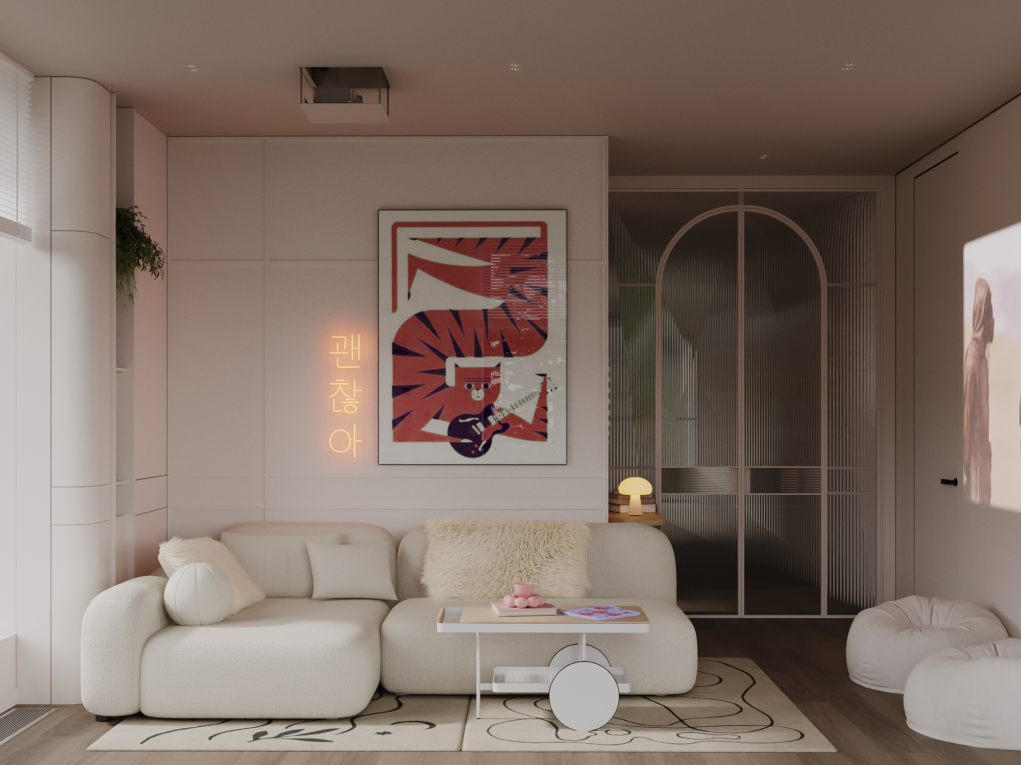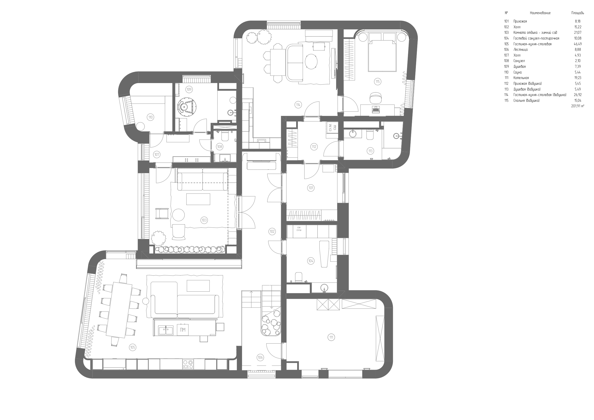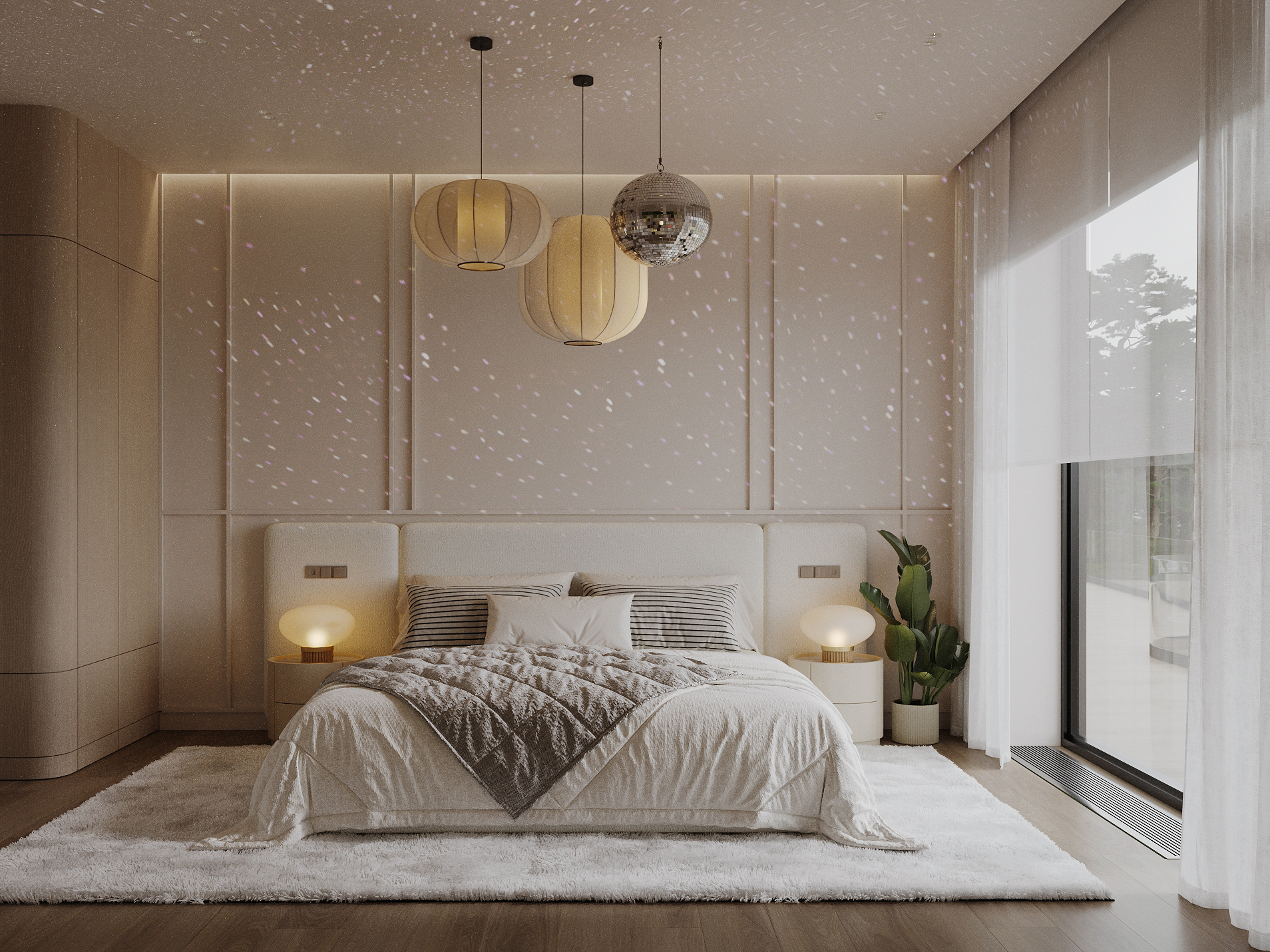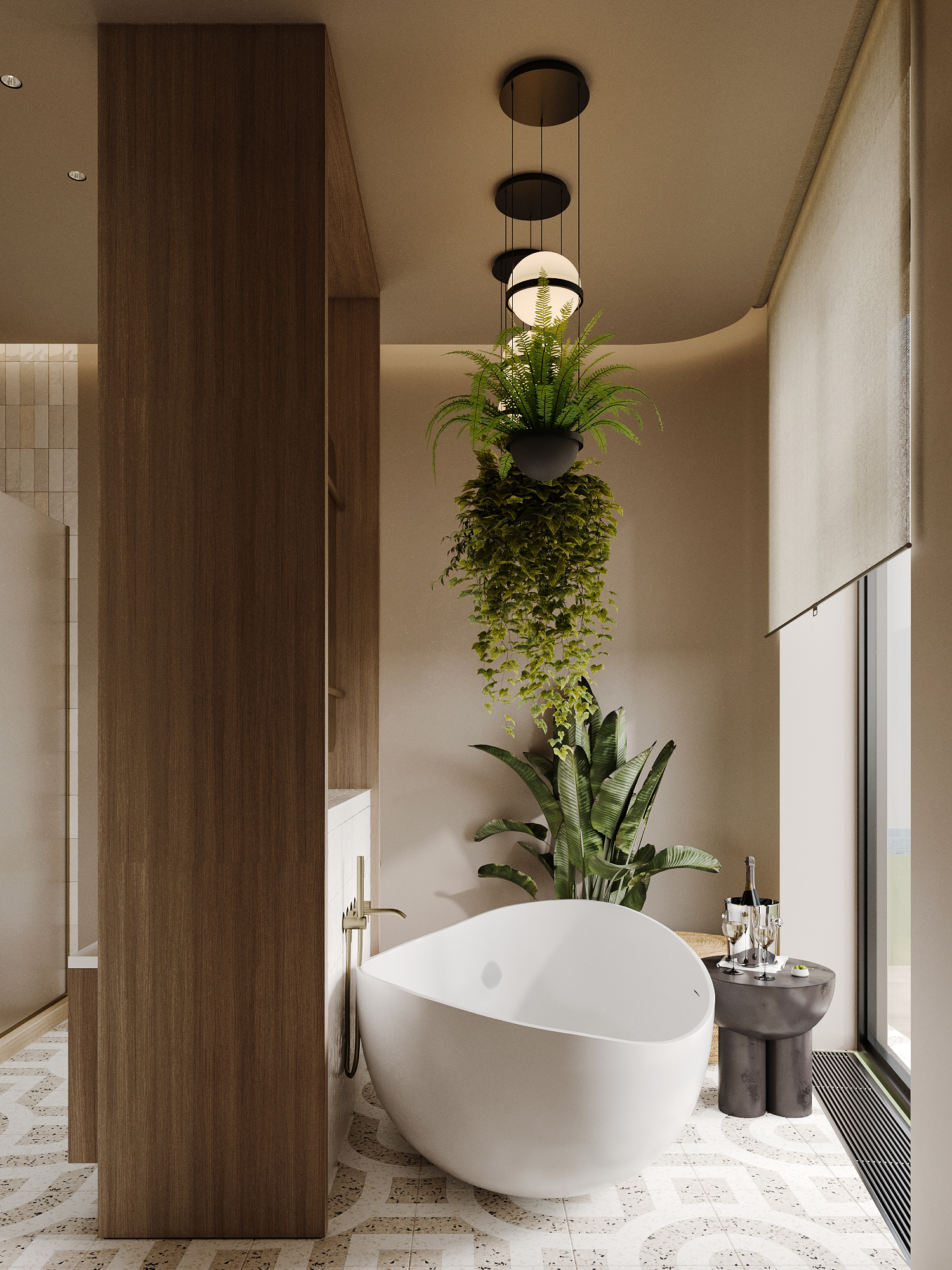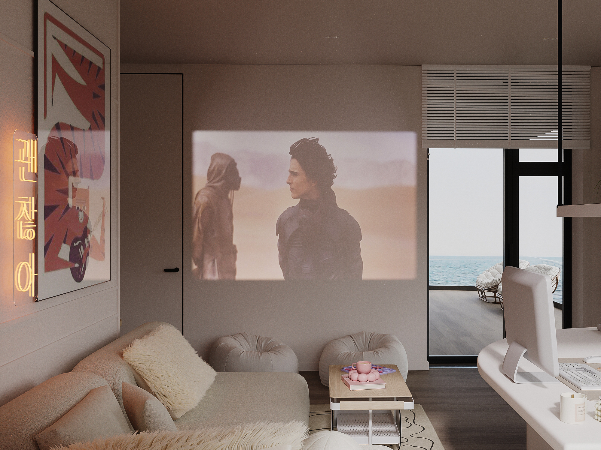 Современный интерьер выполнен в светлой, уютной палитре с акцентом на натуральные материалы и гармоничное сочетание дерева, камня и мягких тканей. Пространство объединяет все помещения, обеспечивая комфорт и функциональность для повседневной жизни и встреч с гостями. Большие окна наполняют помещение естественным светом, создавая атмосферу легкости и спокойствия