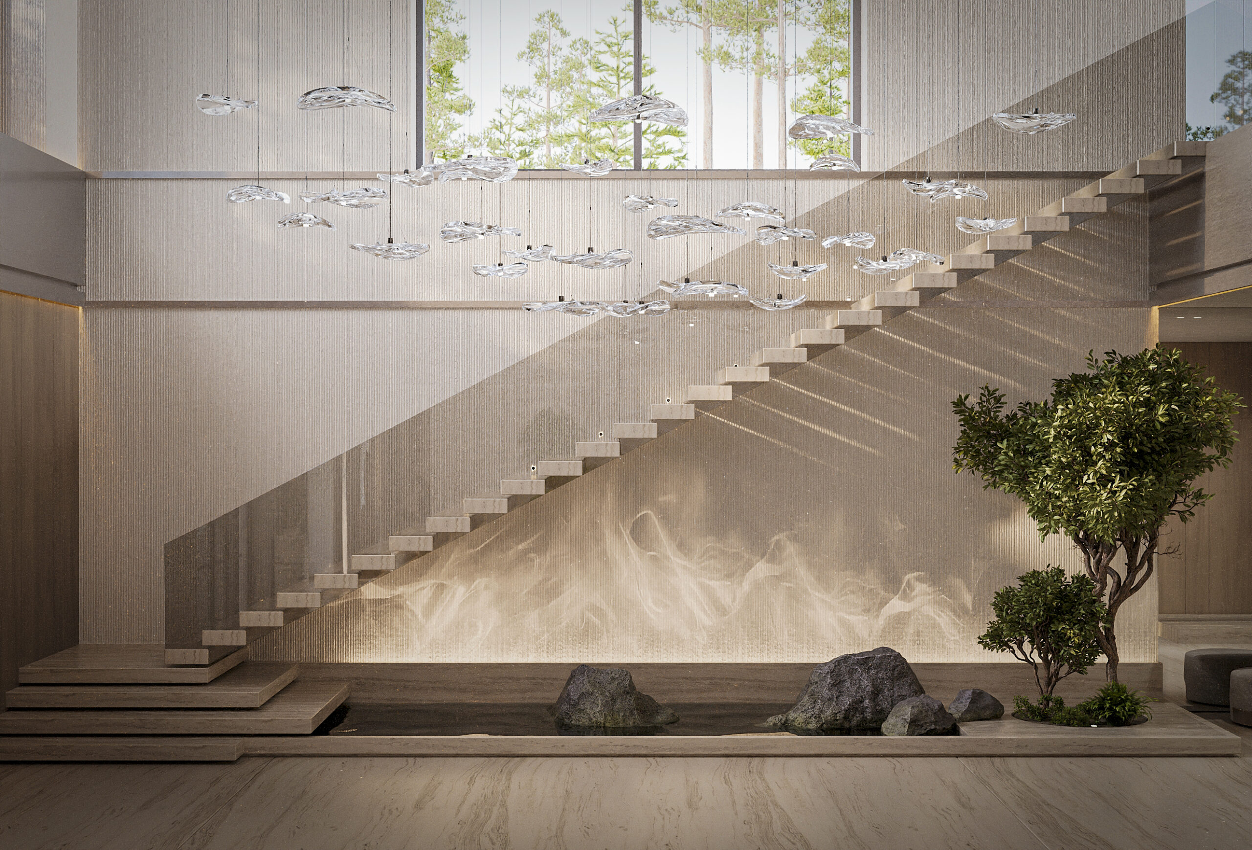 Этот архитектурный объект является пристройкой к основному дому. Его цель — создать пространство для расслабленных или официальных встреч с друзьями, деловыми партнерами, а также приятно провести время, читая книгу на диване под шум стекающих струй воды искусственного водопада, либо бегая на дорожке в спортзале. Основная идея — сохранить чувство единения с природой, дать ощущение комфорта, спокойствия и внутреннего равновесия