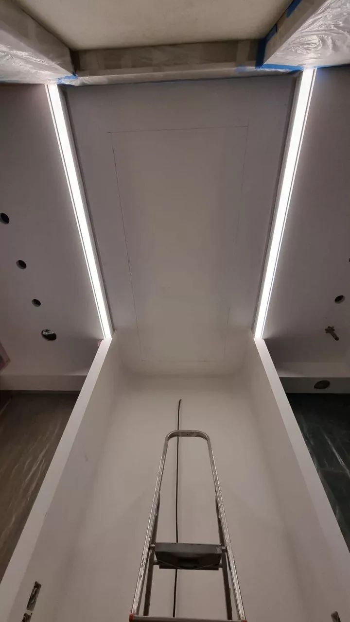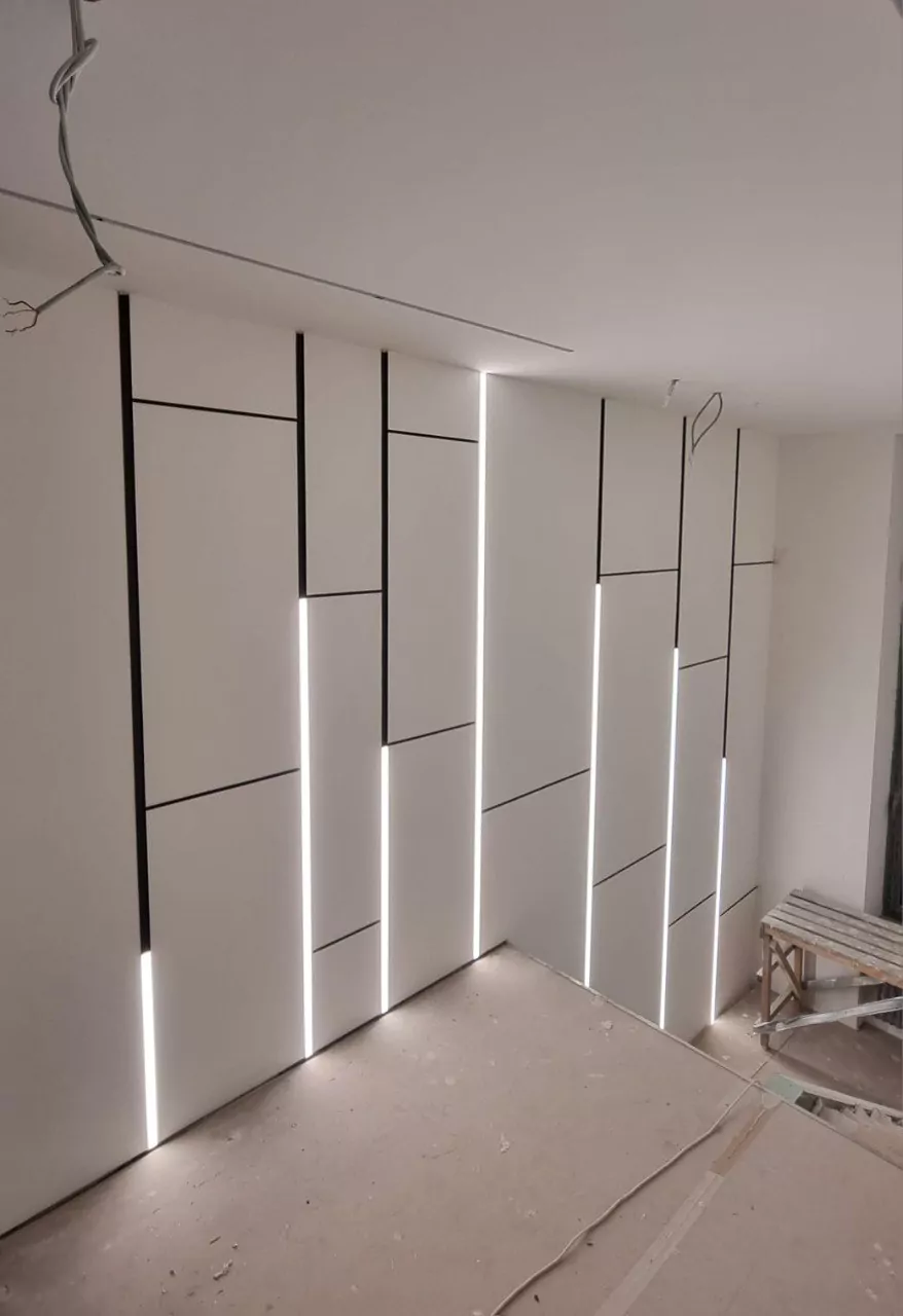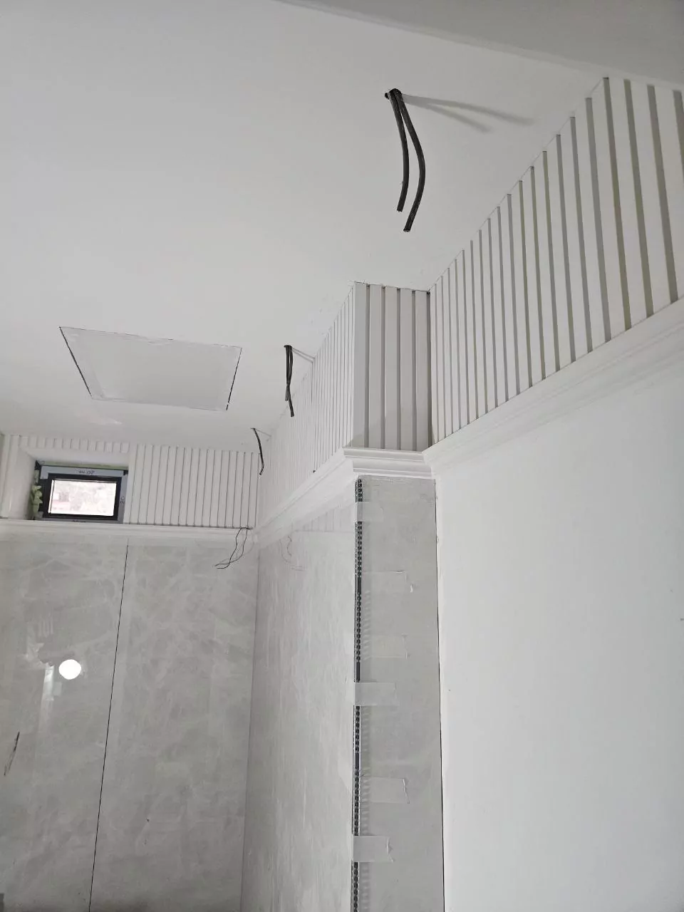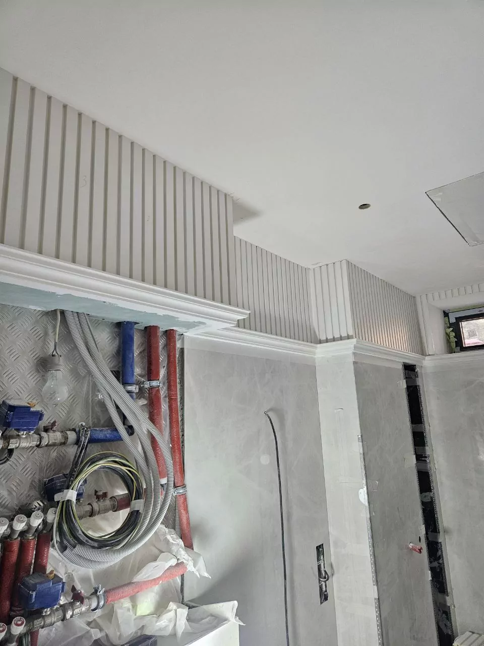Уложили плитку, смонтировали карнизы под подсветку, смонтировали 3D панели