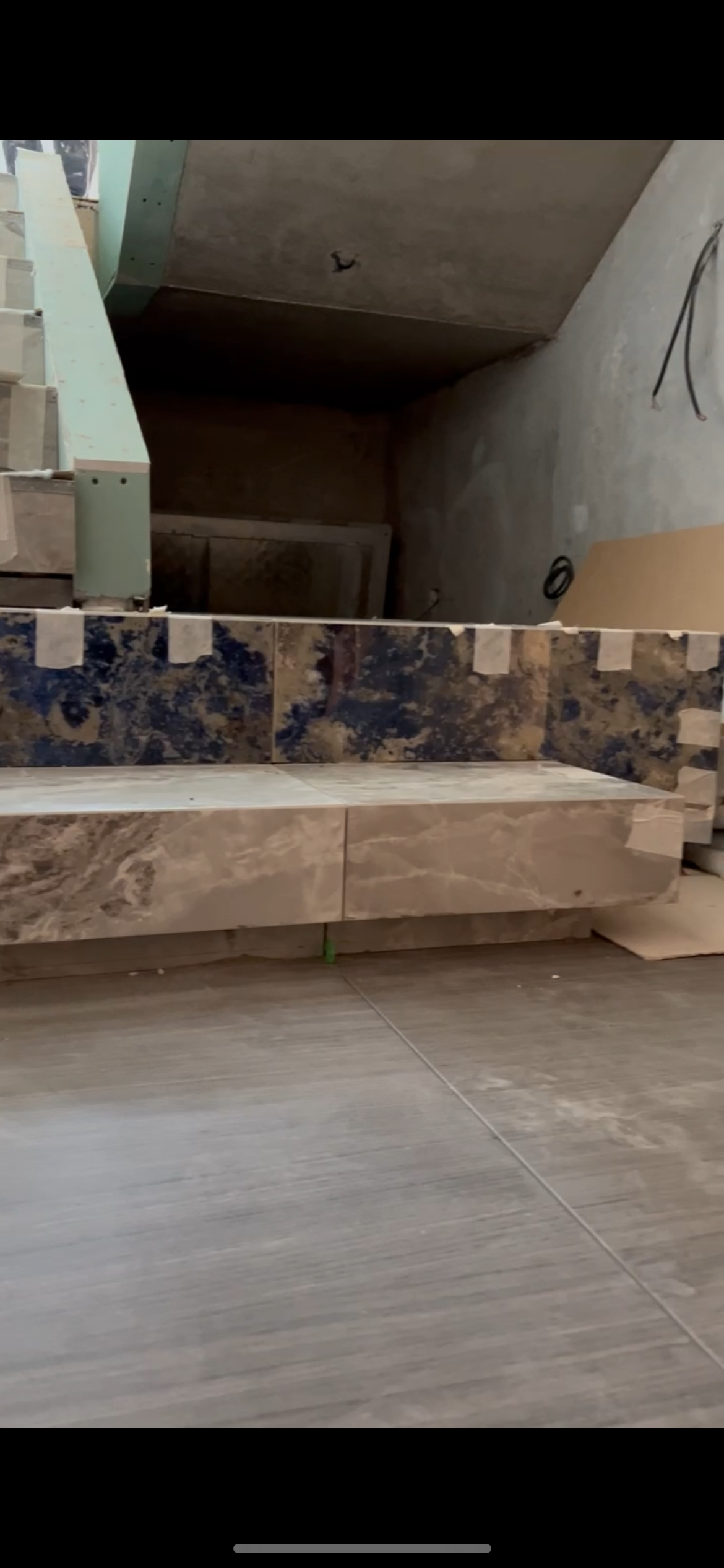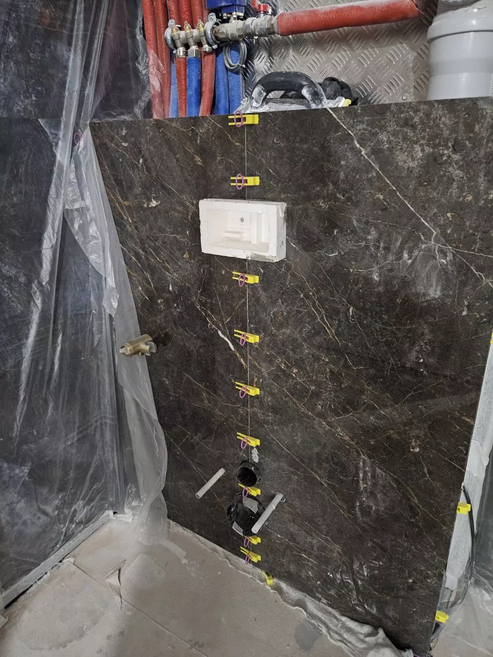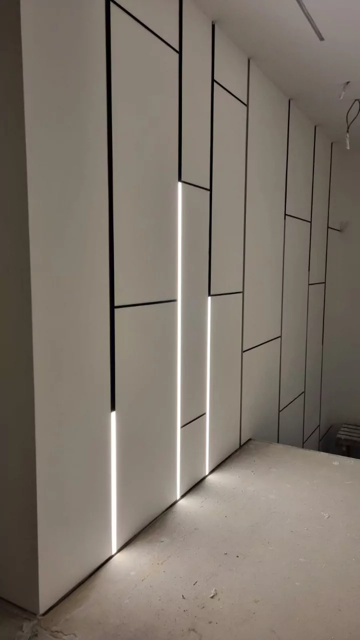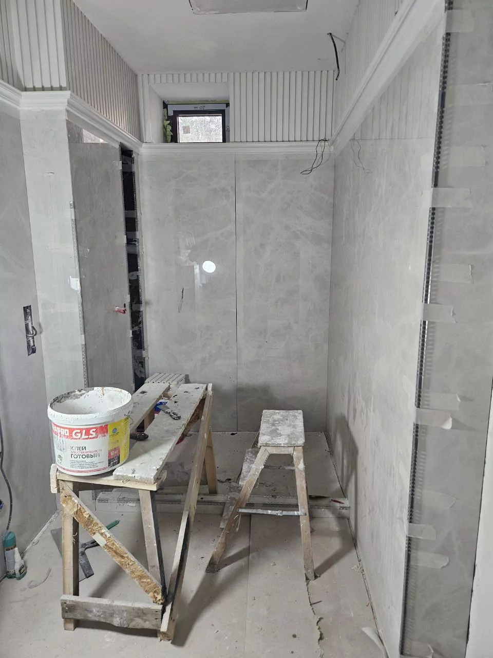 Уложили плитку, смонтировали карнизы под подсветку, смонтировали 3D панели